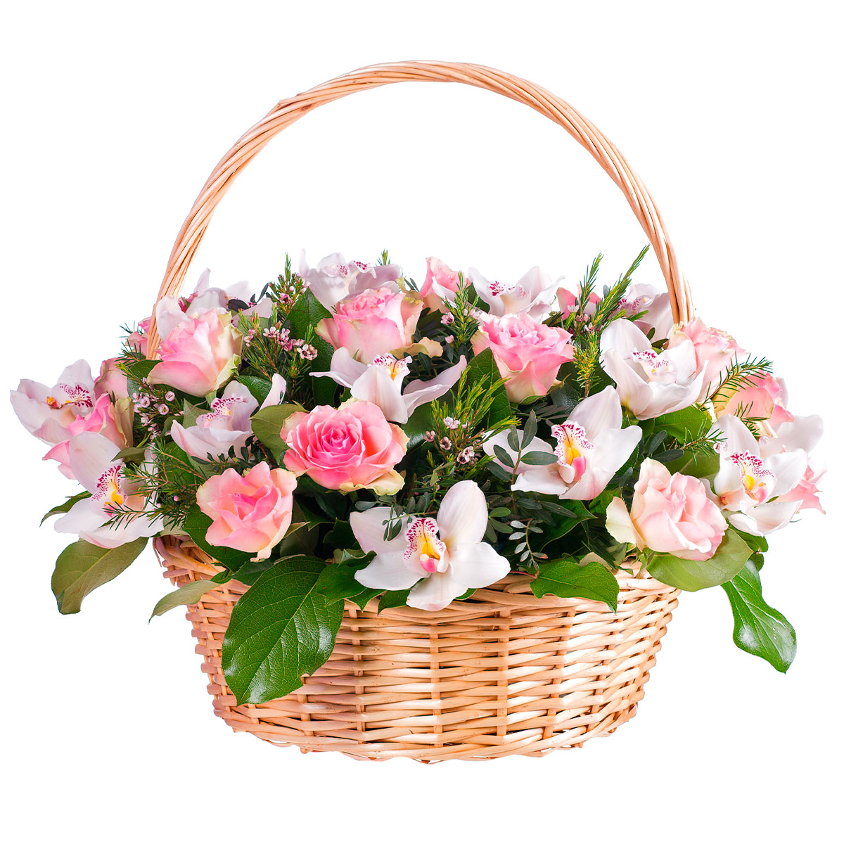 Роза одноголовая розовая, орхидея белая, ваксфлауэр. Упаковка (Корзина, оазис, ящик).